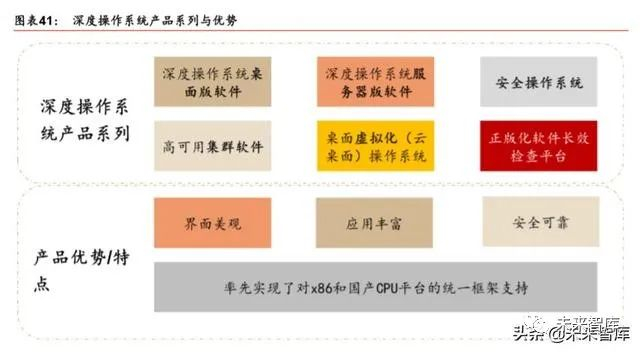 中标麒麟与银河麒麟合并大势所趋。目前国产操作系统厂商众多,其中相对具有竞争力的 国产 OS 厂商主要有中标麒麟、银河麒麟,深度 OS 等,其他国产操作系统厂商还包括普 华软件、中兴新支点、中科方德等。其中中标麒麟和银河麒麟是公认的党政、国防办公领 域的国产 OS 龙头,根据中国软件官方公众号数据,当前中标软件、天津麒麟两家企业在 党政、国防办公等领域占有国产操作系统 90%以上的市场份额。而深度(Deepin)操作 系统则是实际用户数最多、国际排名最高的国产操作系统。为了提升产品竞争力、品牌认 知度及满足客户对统一操作系统的需求,同作为中国软件的子公司,中标麒麟和银河麒麟 合并统一大势所趋且迫在眉睫。未来中标软件和天津麒麟是否能够有效的整合团队和技术、 统一操作系统版本、市场推广和资源整合,将成为麒麟 OS 未来能否在行业市场乃至民用 市场打开局面的关键所在。