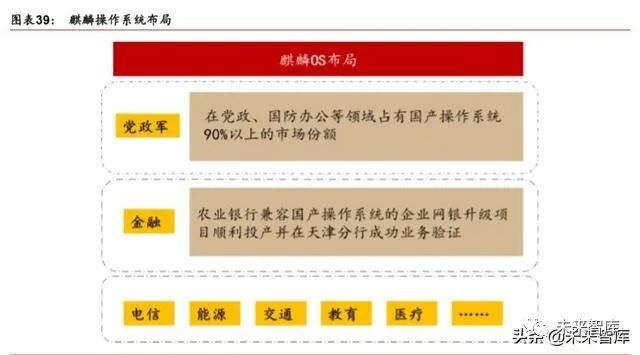 麒麟 OS 不仅在党政军领域占据优势,也正在积极布局行业领域。市场一般认为麒麟 OS 主要在党政军领域占据优势,在行业领域不具备发展优势。我们认为,麒麟 OS 作为国内 发展时间最长、应用最为广泛的国产操作系统,除了在党政军具备优势外,在金融、能源、 交通、医疗等行业领域都有一定应用,如麒麟 OS 在农行企业网银系统正式上线并在天津 分行成功进行业务验证。因此,我们认为麒麟 OS 未来行业领域也会扮演重要的角色。