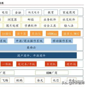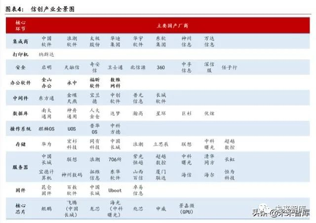 根据上述信创产业架构,我们按照自下而上的架构顺序,对参与其中的主要国产厂商进行 了梳理(不完全统计),绘制出如下信创产业全景图。我们相信,随着信创产业范围的不 断扩大,将会有越来越多的国内厂商参与其中,从而构建起庞大而丰富的信创产业应用生 态。