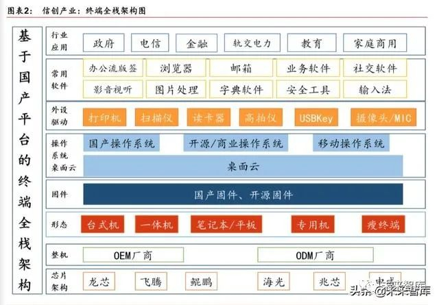 信创产业包含了从 IT 底层的基础软硬件到上层的应用软件全产业链的安全、可控。以“云”和“端”角度为例: