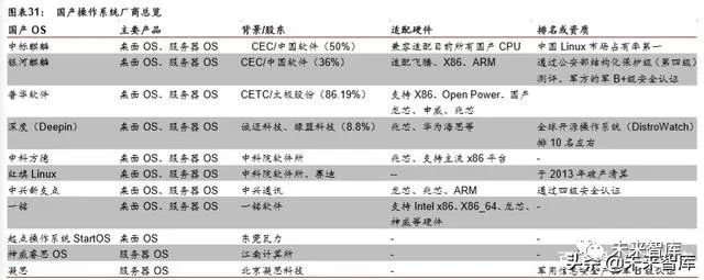 国内操作系统厂商主要有麒麟 OS(中标麒麟、银河麒麟)、深度科技、普华软件、中兴 新支点、凝思、中科方德等公司。各公司简要概况见下表。