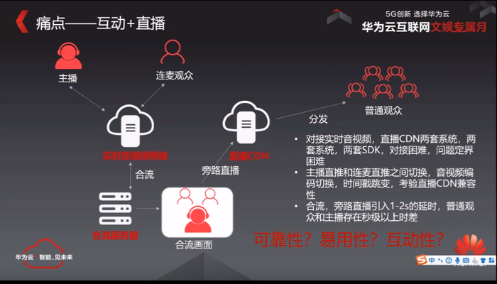 我们来看一下当前的常规的这种互动直播解决方案,实际上看到的现在常规解决方案,大家采用的是一个RTC航路直播到CDN的这种方式去实现的。在这种传统的方式来看呢,,其实我们在整个直播里面,它引入了两套的系统,然后这两套系统它是完全不同的技术体系。对于rtc来说,它是一个基于原始的通信的那套东西,基于rdp的协议,然后基于udp的一个网络去做的一个实时互动。然后直播的这边又是采用了一个HTTP,FMV或者RTMP的一个分发的一个系统。然后对于整个直播平台来说,它需要去对接两套的SDK,然后通过这种方式去满足大家的一个互动直播的需求。但是在这套体系我们也看到了很多的问题,比如说在可靠性上,因为是两套系统,它中间任意一边可能都会出现问题,比如说我直播间卡顿了,或者直播间的延时变大了,到底这个问题是怎么去定界?是谁产生的?是RTC这边产生的,还是直播的CDN这边去产生的?其实这个东西可能很多人去做类似的业务,他也会遇到相似的一个困扰。然后第2点,主播在这种连麦场景里面,他会从直播的CDN和rtc之间来回的去进行一个切换,随着这个切换,中间的音视频的一些编码,视频的分辨率这些东西都有可能会发生一个变化,并且一个时间戳也会产生一些跳变,然后终端实际上对这种时间做跳变或者音视频编码的一些变化,他怎么去兼容?实际上很多终端对这些东西兼容实际上是不好的,更多的东西可能会让cdn自己去兼容,这个中间就会产生了很多,比如说在切片换视频的时候处理不好,产生花屏,或者产生视频的一些卡顿,可能很多人在最早去做这套东西的时候,可能也会有这种体会,这个东西调教起来特别复杂。然后我们再来看一下,对于当前的这种互动直播的场景,在RTC里面它要做一个合流,合流完了以后,然后把它转成一个rtMP协议,然后把它推到cdn上去,在这中间合流这部分,现在一般通用的那个行业里面一般它都会引入1~2秒的延时,然后再加上一些cdn的8个延时可能还会更大,比如说到了3~5秒。实际上我们的普通的观众和主播之间,实际上会一直存在着一个3~5秒以上的延迟,从互动性来说是一个不好的互动,就在这种场景下,我的一个观众,我把它切成连麦以后,实际上是会体会到时间的一个概念。