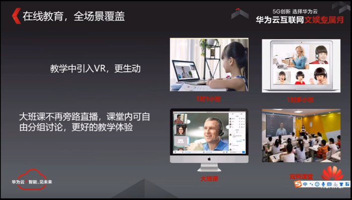 首先在教育场景,我们可以做到一个全场景的覆盖,从现在的一个教育场景来说,我们的教育场景里面它有1对1的小班课,然后有一对多的小班,有大课堂,有双师课堂,然后现在对于1对1的小班课或者双师课堂,更多的实验方式是采用一个rpc的实验方式,但是一个大班课就像一体机,我们提供了一些大班课,其实更多的采用的是一个直播,学生和老师之间的互动性并不好,然后学生像连麦那样去切换一个场景,实际上对于疫情突发的情况下来说,实际上很多家他都没有完成这种切换,他可能还是用一个传统的直播,然后我们通过这套系统,我们可以去把整个教育的场景全部统一到一套传输系统上来,老师他可以和学生之间随时的去做一个互动,就像我们上课一样,我随时可以去点一个学生起来,然后他去和老师进行一个互动,去回答老师的问题,我也可以把几个学生分成几个组,让学生之间相互的去讨论问题,老师可以去看到他们的一个讨论场景,其他人也可以去看到讨论场景,我们可以引入一些VR的技术,再通过一个VR,我们可以老师可以在课堂上进行更生动的一些展示,比如说一些实验课程,这个是在一个教育的场景。