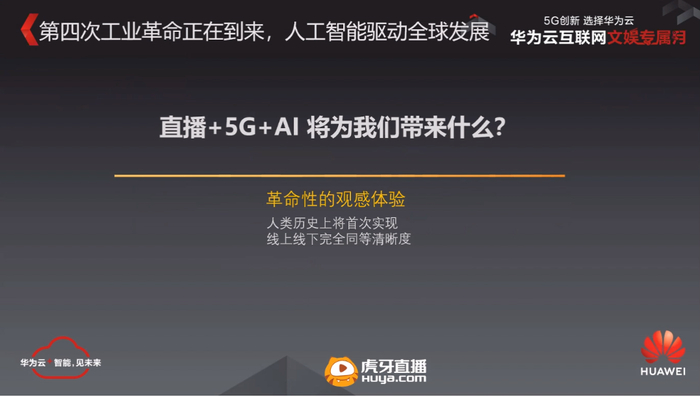 直播和5G最终会给虎牙带来什么?就从虎牙的使命来讲,我们希望是为观众带来革命性的观感体验。我们希望让观众能够在线下线上体现到一样的清晰度。这个清晰度不仅仅是视觉和听觉上的,也包括了互动体验上面,希望我们可以打破这种虚实的界限。我们希望用当下最先进的这种技术来驱动使命的实现。以上讲完了这种高大上的一些概念以后,我们可以具体来看一下虎牙在5G和 AI的整体的一个体系架构,以及我们与华为云具体的一些合作点。