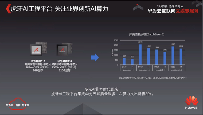 在与华为云联合创新中,华为云给我们提供了高性价比的昇腾310芯片,帮助我们在AI的推理上面的降本增效,有利于我们去更多的去尝试AI的一些算法。虎牙从2019年开始与华为的生成芯片已经展开,全面的测试和商用的准备了。具体其实会体现在几个方面:
