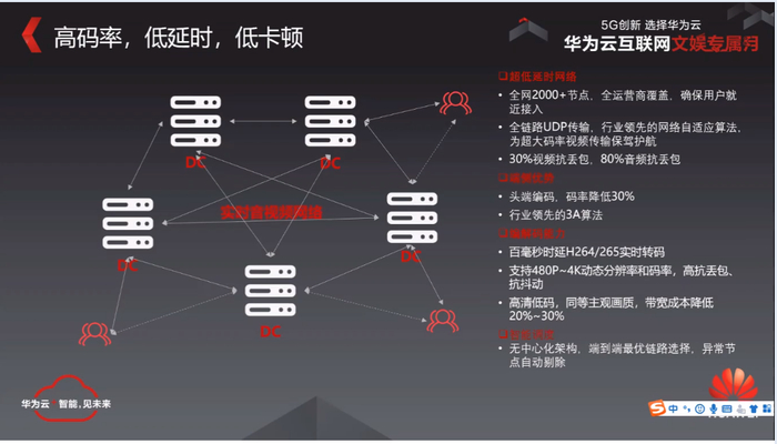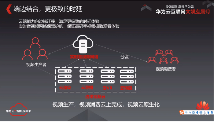在5g时代到来了以后,我们华为云也正在把我们未来的视频的生产和视频的存储,把它往边缘上去搬,然后我们定义了一个边缘视频云的概念,实际上我们正在把我们的云线的云导播、云VR甚至云端码,全部都在往相应的一个边缘区进行一个搬迁,然后去结合我们的超低延迟视频的传输网络,来保证我们的媒体的处理能力离用户更近,来确保我们的视频的单向的时延,能够得到更高更好的一个单向时延的一个体验。就拿云游戏来说,对于云游戏的那种主播来说,他可能200毫秒对他来说体验都是会比较差的,我们能把单向的传输时延,把它变到10毫秒以下,然后说再加上一些渲染之类的这些东西,我们预期它会做到40~50毫秒的一个时延,就整个端到端的这种处理能力。