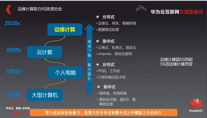 最后可以再跟大家分享一下,其实虎牙在边缘计算上面的一些思考,病人计算虎牙其实从18年就开始在做一些布局了,但随着AI和5G的进一步推进,也同时因为更多的数据会在边缘产生更低时间互动需求的这样的一些推动。边缘上面,仅仅是内容粗加工和分发已经不能满足需求了,必须要将更复杂的计算下沉到边缘。那么从整个计算机历史的发展上面,其实也能够看到,中心和边缘它本身就是一个螺旋式上升的这么一个趋势。在5G时代,在IT和CT融合的时代,必将在计算机体系架构上会发生变化,计算的位置上面其实也会发生变化。会出现类似于像arm服务器、NPU加速器,这样大量会在边缘去做一些布局。