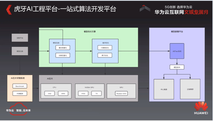 在310联合的测试里面,我们是用它来主要是做内容审核以及我们几个比较大的场景算法的落地。310芯片具备在Int8的整型的情况下处理能力能够达到8T floats功耗非常低,支持多种数据精度,满足虎牙当前的在内容审核上面各种模型的和性能对比,大概有30%的性价比的一个提升。那么目前其实我们也在做更多的一些技术上的优化,比较有信心能够去提升到两倍或者三倍的性能。那么另外一个方面是昇腾910,910主要是会用在我们的训练上面,这一块我们现在也在同步在做一些合作。这一块上面对于我们训练的优化,对于训练速度的提升是非常有帮助的。第3个方面能够将AI算力能够用在多个场景上面做容器化部署,尤其是在边缘上面,这个是我们跟华为提的具体的需求。我们希望310也好、910也好,能够更多的在边缘去做一个推进,这个是我们具体在做的一些合作方向。