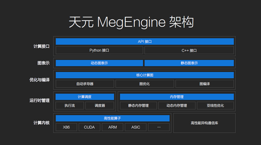 如下图所示,天元深度学习框架由计算接口、图表示、优化与编译、运营时管理和计算内核五个层次组成。这次旷视将合计开源代码35万行,其中包括了C++的code、CUDA的code、Python的code。