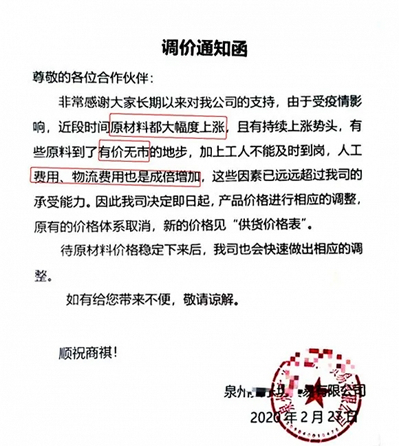 “所有产品单价上涨5%,超出正常运费部分由客户承担,持续到疫情得到控制,原材料下降。”