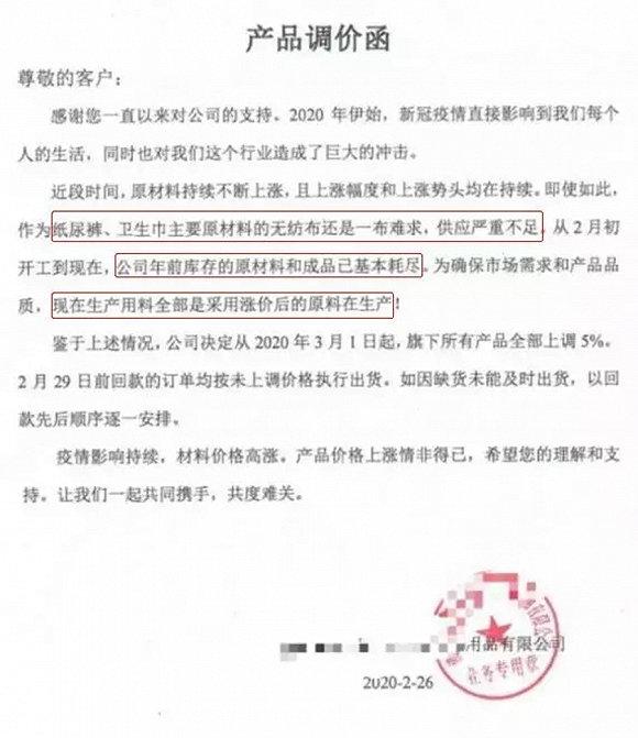 2月17日,广州市贝乐熊婴幼儿用品有限公司正式发布一份调价函,针对其旗下产品,包括纸尿裤进行提价,产品单价上涨5%,超出正常运费的部分由顾客承担,调价生效时间一直持续到疫情结束。