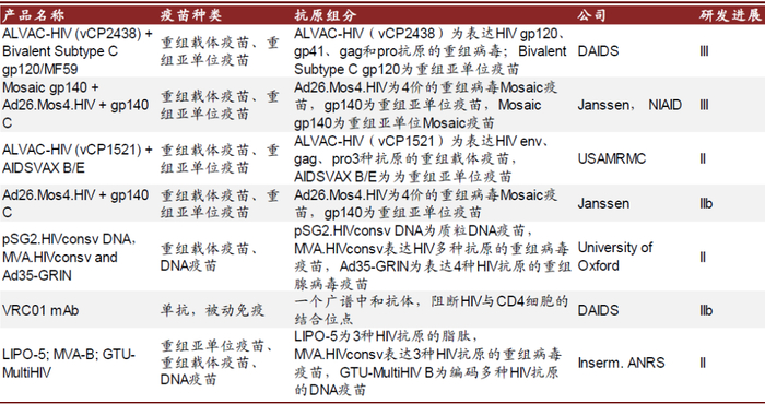 多个HIV疫苗产品已进入研发后期。自1987年就陆续有HIV疫苗进入临床阶段,但是部分在有效性试验中未得到理想的效果,HIV疫苗的研究有两个难点:1)尚未发现通过自然免疫过程清除HIV感染的案例,意味着HIV感染诱导的免疫反应可能无法有效应对HIV感染;2)HIV具有较高变异性。尽管经历了一些失败,但人们总是在尝试新的技术方法,包括Mosaic疫苗、DNA疫苗、被动免疫等。