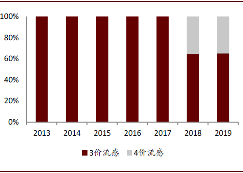 多价苗可对低价苗形成一定程度替代。由于多价苗能够针对更多血清型病原体起到保护作用,因此可对低价苗形成一定程度的替代。以HPV疫苗为例,2019年2价HPV疫苗批签发量占比仅有18%,4价HPV疫苗批签发量占51%,9价HPV占31%。同样,在流感疫苗中,2018年获批的4价流感也对3价流感产生了明显的替代,2019年4价流感疫苗批签发量占比达到了35%。
