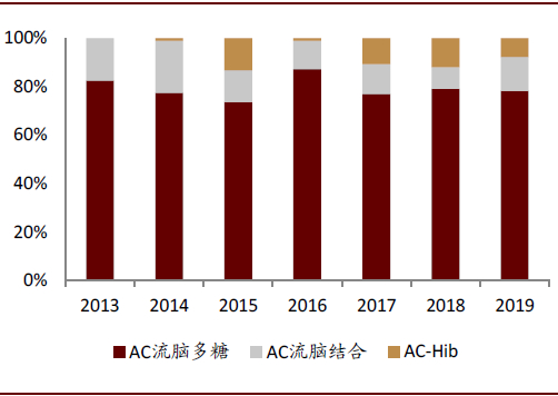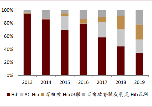 多联苗可以对单联苗形成市场替代。由于多联苗接种次数少,给接种人和医务人员都带来便利,可以提高依从性和接种率,并降低预防接种工作的服务成本,因此我们预计有望对单联苗形成市场替代。以Hib的多联苗为例,即使多联苗的接种费用比单联苗高,AC-Hib三联苗、百白破-Hib四联苗、百白破脊髓灰质炎-Hib五联苗已经对其产生了较大的替代,Hib单联苗的批签发量占比从2013年的95%降至2019年的35%。