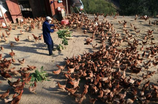 2月22日,诸暨暨南街道新胜村的杨棚图在农场里喂鸡。2月中旬,浙江省诸暨市农业农村局针对因新冠肺炎疫情造成的农产品销售难问题开展上门服务,对接多家线上平台,并通过当地政府部门的微信公众号等“吆喝”售卖,帮助当地养殖户、种植户渡过难关。新胜村经营农场养鸡的杨棚图因此获益,农场里因疫情影响积压的五千多只鸡、十万多个鸡蛋均已卖出。图/新华