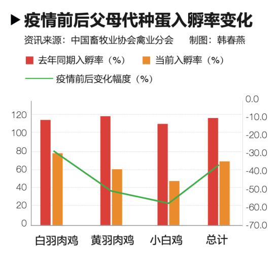 济南康普赛恩生物科技有限公司销售经理苏晓东给《中国新闻周刊》算了一笔账。目前没有准确的数据统计肉鸡缺口有多少,不过可以进行推算:去年末,全国“父母代种鸡(指经过育雏育成后,按照设计的品系间进行杂交、产蛋,用于孵化繁育商品鸡的种鸡)”存栏最高量约3700万只,按照正常产蛋率和孵化率,大约每天能出近1600万只鸡苗。以此计算,春节到正月十五这15天,将减少约2.4亿只鸡苗。以肉鸡成长周期42天计算,这些缺口带来的价格变动,将在3月中下旬后逐步显现。