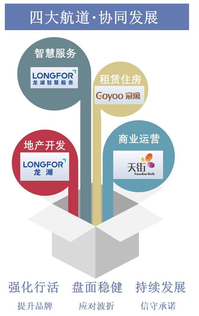 龙湖集团于2018年提出“空间即服务”战略,在房地产开发业务之外,将商业运营、租赁住房及智慧服务也列为发展主航道业务,专注于客户的全生命周期需求,形成后规模时代均衡稳健发展的业务架构。2019年龙湖在传统主业物业开发稳健发展的基础上,持续为商业运营、租赁住房、智慧服务的快速发展提供充足的资源支持,形成良性的相互协调机制。