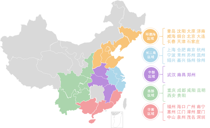 从区域贡献率来看,长三角、西部、环渤海、华南及华中的合同销售额分别为832.9亿元、592.0亿元、522.5亿元、263.0亿元及223.6亿元,分别占全年总合同销售金额的34.0%、24.4%、21.6%、10.8%和9.2%;其中,长三角区域的贡献度最大,且贡献度明显提升,较2018年提升6.1个百分点,环渤海区域贡献度有所下降,较2018年下降12.8个百分点,其他区域基本保持稳定。