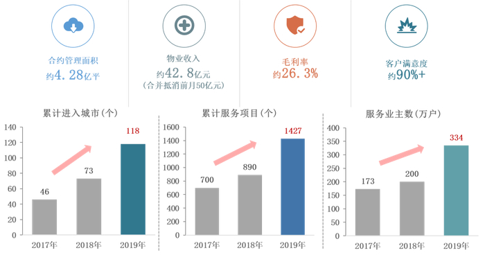 龙湖智慧服务经过两年多的扩张拓展与系统打磨,整体业务在2019年也实现巨大突破。全年新进45个城市,基本完成一、二线核心城市及三、四线潜力城市的布局,实现营业收入42.8亿元(合并抵消前月50亿元),近5年的复合增长率达到42%;龙湖智慧服务累计已在全国118个城市开展专业化的物业服务,合约管理面积达4.28亿平方米,服务业主330余万户,业主满意度连续十一年超过90%。