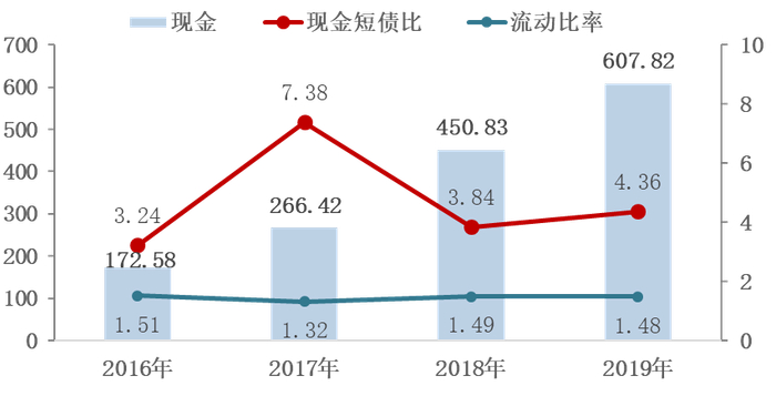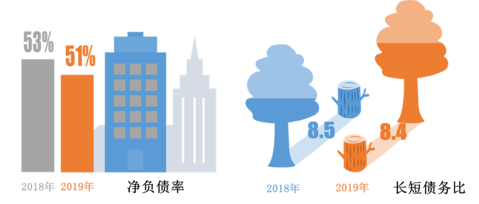 在行业融资持续收紧的背景下,龙湖集团顺应国家“去杠杆、降负债”要求,债务结构得到进一步优化。2019年龙湖净负债率同比保持小幅下降态势,在手现金为609.5亿元,净资产为1666.8亿元,整体净负债率为51.0%,较2018年下降2个百分点,整体处于房企中低水平。
