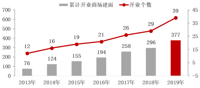 2019年是龙湖商业运营爆发的一年,此前商业投资为龙湖提升的是内在竞争力,现如今商业已经开始崭露头角,截至2019年12月31日,龙湖集团全国范围内累计开业商场达39座,已开业商场建筑面积为377万平方米,整体出租率为98.5%。商业租金增长31.9%至47.5亿元,同店增长达到19%;商场销售额为267亿元,同比增长25%;全年平均日客流为154万人次,同比增长23%。
