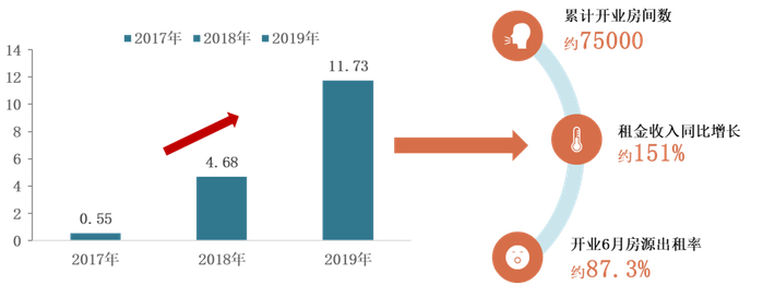 整个行业来看,出租率低、盈利难是长租公寓面临的普遍问题,2019年龙湖租赁住房业务冠寓产品规模实现突飞猛进增长,冠寓通过核桃、松果、豆豆三条产品线切入细分市场,满足不同人群的居住需求,截至2019年底,冠寓已陆续在全国30余个高能级城市开业运营,累计开业房间数量达7.5万间,同比增长41.5%,租金收入为11.7亿元,同比增幅达150.6%,开业超过六个月的房源出租率为87.3%。