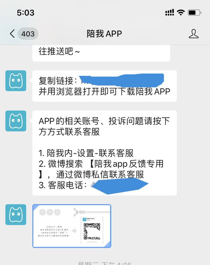 新京报记者调查发现,虽然陪我APP已在各大应用市场下架,但通过认证为陪我欢乐(北京)科技有限公司置顶的官方微博仍可以获取下载链接。同样,通过认证为上述公司的微信公众号“陪我APP”,也可以获取下载链接。此外,一位自称“陪我工作人员”的网友在百度贴吧“陪我吧”中发送了一个下载链接。记者用上述三种方式进行下载测试,均能成功下载该APP。记者注意到,陪我公众号留下的电话客服也会在电话中告知用户如何获取这些链接。
