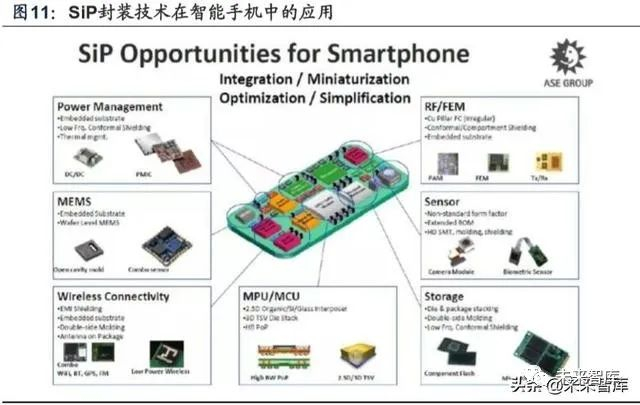日月光是全球第一大半导体封测厂商(含环旭电子、矽品)。2010 年购并环旭 电子,将本身封装技术与华旭电子的模组设计与系统整合能力结合,布局发展 SiP 技术。日月光在 SiP 技术领域始终保持领先地位,陆续获得手机大厂苹果的订单, 如 Wi-Fi、处理器、指纹辨识、压力触控、MEMS 等模组,带来后续成长动力。