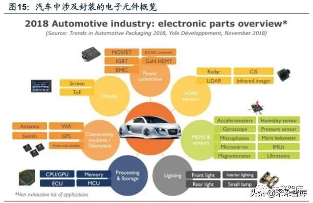 汽车电子中不同类型、工艺的芯片之间较多采用 SiP 整合方式,形成一个完整 的控制系统。目前,SiP方案可微处理器、存储器、输入输出接口、模数转换器等大 规模集成电路及合成发动机控制单元。另外,汽车防抱死系统、燃油喷射控制系统、安全气囊电子系统、方向盘控制系统、轮胎低气压报警系统等采用 SiP 的形式也在 不断增多。