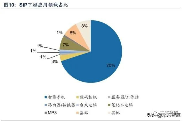 SiP 封装广泛应用在 TWS 耳机、智能手表、UWB 等对小型化要求高的消费电 子领域,以及工业和物联网领域等。根据智研咨询统计,智能手机占据 SiP 下游产 品应用的 70%,是最主要的应用场景。