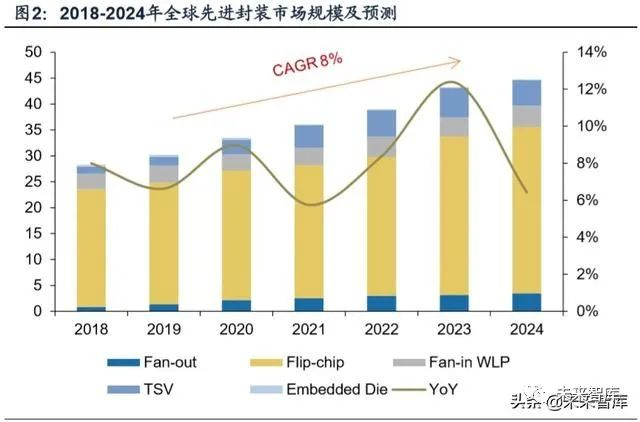 全球先进封装市场规模保持逐年成长趋势,Flip-chip 技术占据主要市场份额。根据 Yole 数据统计,以8%的年复合成长率成长,到 2024 年达到约 440 亿美元。