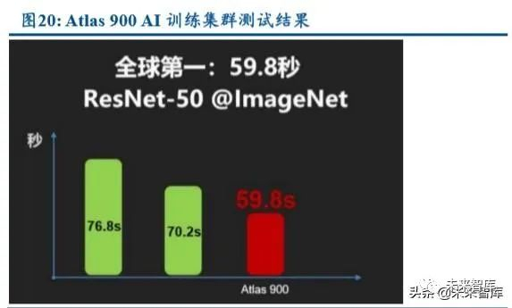 基于“昇腾 910” AI 芯片,推出超强算力的 Atlas 900 AI 训练集群。华为通过数千颗昇 腾 910 互联构成 Atlas 900 AI 训练集群,通过部署大规模分布式 AI 集群环境来提高神经网络 训练系统的浮点计算能力,而每颗昇腾 910 AI 处理器内置 32 个达芬奇 AI Core,使得单芯片 提供比业界高一倍的算力(256TFLOPS@FP16),促使Atlas900训练集群总算力达到256P~1024P FLOPS @FP16,相当于 50 万台 PC 的计算能力。目前,华为已在华为云上部署了一个集聚 1024 颗 910 的 Atlas 900 AI 训练集群,基于当前最典型的“ResNet-50 v1.5 模型”和“ ImageNet-1k 数 据集”,Atlas 900AI 训练集群只需 59.8 秒就可完成训练,排名全球第一。