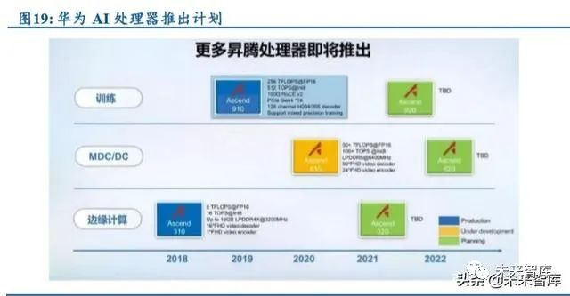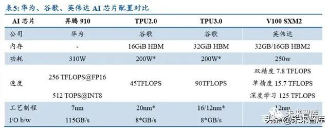 “昇腾 910”是已发布的单芯片计算密度最大的 AI 芯片,单片执行速度超过同期 AI 芯片。910 除了基于达芬奇架构的 AI 核外,昇腾 910 还集成了多个 CPU、DVPP 和任务调度器 (Task Scheduler),因而具有自我管理能力,可以充分发挥其高算力的优势。其制程采用的是 7nm+技术,16 位浮点下的单片计算速度为 256 TFLOPS,高于目前谷歌 TPU3.0 的 90T 和英伟 达 V100 的 120T。