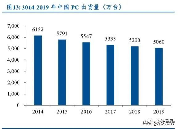 我们预测 2023 年鲲鹏计算产业中 PC 的市场规模约为 390 亿,出货量约 780 万台。 1) 考虑过去 5 年 PC 出货量和 PC 终端总量变动关系看,我国 PC 销售进入存量市场,即更新换 代为主要需求。我们预测未来 3 年 PC 销售约为每年 5000 万台,故更新换代率为 5000/28000=17.85%。考虑我国信创战略和公务更换需求,我们预测公务 PC 的更新替换率为 20%。2)目前我国财政供养人员总数为 5000 万人,按人均 0.9 台的公务 PC 比例算,全部公 务 PC 数量为 4500 万台。考虑每年 20%的替换率和鲲鹏 PC80%的市占率,则每年鲲鹏公务 PC 出货量为 720 万台,公务 PC 单价约为 5000 元/台。3)目前华为和荣耀电脑在笔记本端的市占 率为 13.9%(均为消费者市场) ,假设 2023 年笔记本电脑占 PC 市场的 40%(2018 年上半年全 球笔记本电脑出货量是全球 PC 出货量的 34.1%,其中消费者 PC 占比约为 40%),华为旗下笔 记本市占率于 2023 年升至 15%(消费者市场),其中鲲鹏 CPU 出货占比为 50%,则消费者市 场部分的出货量为 60 万台,消费级 PC 单价约为 5000 元/台。4)合计 720*0.5+60*0.5=390 亿 市场。