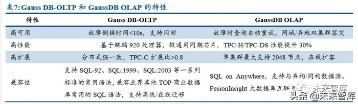 高可靠、高性能和高扩展为 GaussDB 核心优势,其中 ARM/X86 通用意在瞄准国内替 换市场。华为 GaussDB 的高可靠性表现在全组件 HA,无单点故障。即数据节点采用 HA +Handoff 技术,协调节点多活。扩容业务不中断。扩容过程中支持数据增、删、改、查, 及 DDL 操作;由于全并行计算,行列混存+向量化执行,因而实现万亿数据关联分析秒级 响应;并行 Bulk Load,数据快速入库体现数据库的高性能;数据库采用 Shared-nothing 架 构,具备超强的 Scale-out 横向扩展能力,可扩展至 2048 节点;可通用 X86/ARM 架构,扩 容成本低。