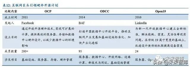 Wintel 以外是开源的世界,互联网巨头助力开源计划。目前 Wintel 打造的硬软件生态 是个人PC时代的信息垄断,垄断CPU和基础软件行业,即Intel在CPU市场的份额为90.41% (2018),微软在操作系统市场的份额为 84.89%(2019)。除此以外的市场份额被开源产品占据,例如 ARM 对抗 Intel, Linux 对抗微软,MySQL 等开源数据库对抗 Oracle。云计算带来的是软件和应用的革命,从而进行逆产业链的革新。云厂商掌握者最强算力和技术最新的数据中心,因而需要高集成、模块化、面向应用的硬件设备,这些是传统品牌商无法提供的,因而 Facebook、阿里巴巴、LinkedIn 先后发起了硬件开源计划,通过重新设计硬件 技术,满足云计算带来的计算基础架构更新需求。