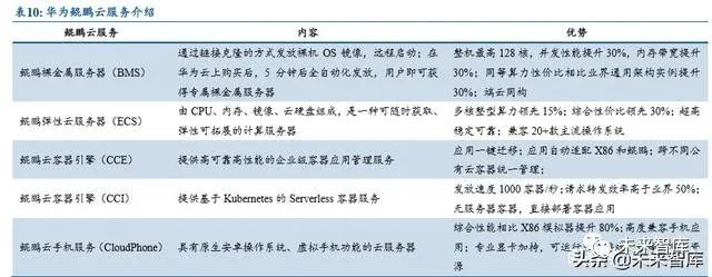 四大鲲鹏基础云服务、全栈混合云华为云 Stack8.0 助力企业上云。目前华为云已发布 五款鲲鹏云基础服务,包括鲲鹏裸金属服务器(BMS)、鲲鹏弹性云服务器(ECS)、鲲鹏云 容器引擎(CCE、CCI)、鲲鹏云手机服务(CloudPhone),具有多核算力、高性价比、端云 协同、生态丰富等优势。此外,2019 年 9 月华为云还发布了基于鲲鹏处理器的全栈混合云 解决方案华为云 Stack 8.0,具有“X86+鲲鹏”双架构、“云上+本地”双平台, 公有云、私 有云统一架构等特性,实现将应用数据部署在线下的私有云、需求部署在公有云的平台上的 多场景协同、“一个企业一朵云”的混合云交付模式;用户也能够实现 X86 和鲲鹏体系的混 合部署,实现无缝连接。
