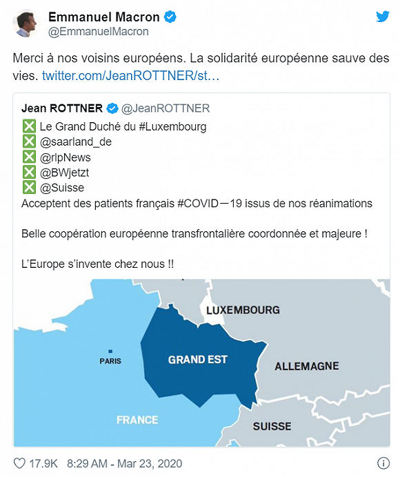 面对汹涌疫情各自为战的欧盟各国似乎迫切需要这样一个团结的信号。法国总统马克龙在推特上特意写道:“欧洲的团结正在拯救生命”。