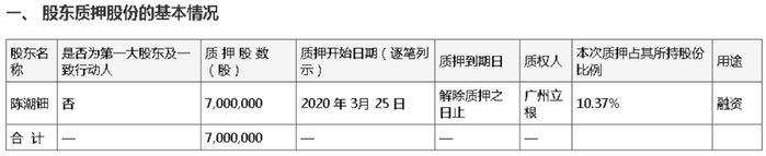 3月27日,东方锆业发布股东质押公告称,近日收到中国证券登记结算有限公司及公司股东陈潮钿先生的通知,陈潮钿先生将其持有的公司部分股权700万股质押给广州立根小额再贷款股份有限公司(以下简称“广州立根”)。