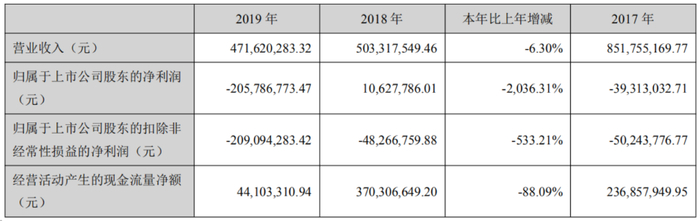 年报显示,公司2019年实现营业总收入4.72亿元,同比下降6.3%;归属于上市公司股东的净利润为-2.06亿元,较上年的1062.78万元骤降-2036.31%。