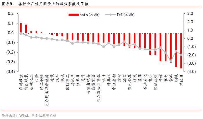 2、中游制造、必须消费、TMT板块受信用因子上行的负面影响更显著,因为这些板块以小公司居多,而小公司本就面临着更大的经营风险和更恶劣的融资环境,对信用利差走阔更敏感;
