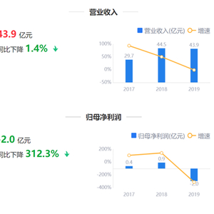 鹰眼预警显示,2017年-2019年公司营业收入分别为29.7亿元、44.5亿元、43.9亿元,同比增长率分别为93.66%、50.14%、-1.42%,2019年营收增速转负;归母净利润分别为0.4亿元、0.9亿元、-2.0亿元,同比增长率分别为106.21%、143.11%、-312.28%,2019年公司净利润由盈转亏。
