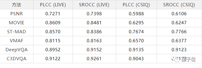 将所提出的C3DVQA与常用的全参考质量评估算法进行对比,包括PSNR,MOVIE,ST-MAD,VMAF和DeepVQA,结果如下: