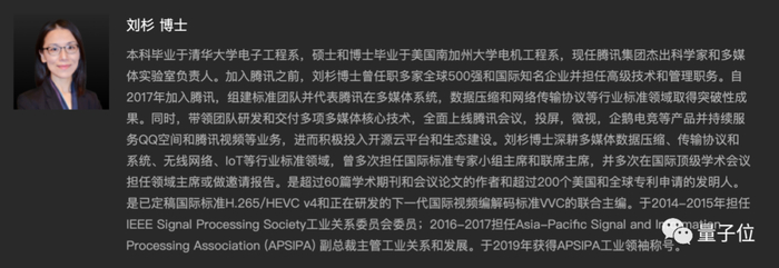 刘杉本科毕业于清华大学电子工程系,硕士和博士毕业于美国南加州大学电机工程系,2017年正式加盟腾讯。