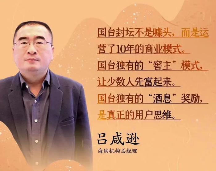 “国台封坛不是噱头,而是运营了十年的商业模式。国台独有的窖主模式,让少数人先富起来,国台独有的酒息奖励,是真正的用户思维。”吕咸逊表示。