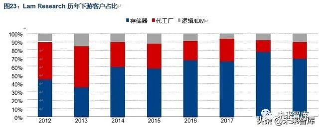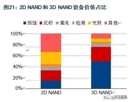 存储器是半导体销售额中占比最大的一类芯片,DRAM 和 NAND 占据超过 90%的存储器份额。存储器虽然不需要最先进的制程制造,但也都达到了 1X nm 级别(即十几纳米),刻蚀设备使用量明显增加。并且,2016 年以后,各大原厂均进入了 3D NAND 量产的时代。3D NAND 采用将存储单元堆叠的布局,需要更多的通孔和导线等的刻蚀,相比于 2D NAND 的制造,3D NAND 中刻蚀设备的支持占比由约 15%提升到约 50%。以泛林半导体的财报披露数据来看,来自存储器厂商的营收贡献量从 2012 年的 40%左右提升至 2019 年的70%左右,主要来自刻蚀设备出货量的变化。因此 3D NAND 的量产再次提升了刻蚀设备的需求。