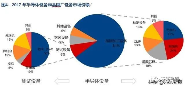 半导体设备中晶圆加工设备价值占比超过 80%,其余为封装和测试设备。在晶圆加工设备中,光刻机、刻蚀机和薄膜沉积设备三类主要设备合计价值占比接近 70%.