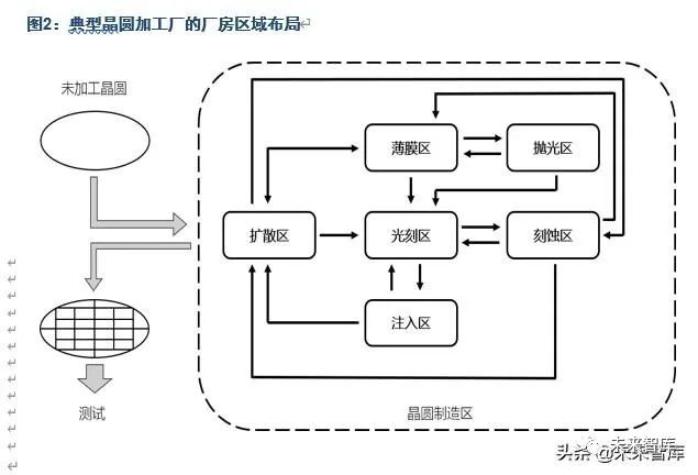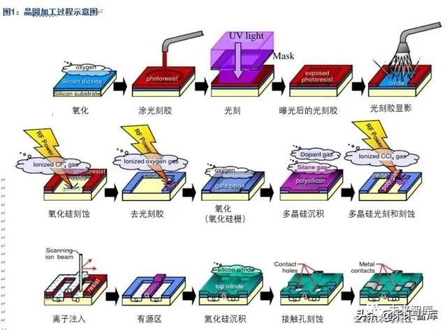 前道的晶圆加工工艺包括氧化、扩散、退火、离子注入、薄膜沉积、光刻、刻蚀、化学机械平坦化(CMP) 等,这些工艺并不是单一顺序执行,而是在制造每一个元件时选择性地重复进行。一个完整的晶圆加工过程中,一些工序可能执行几百次,整个流程可能需要上千个步骤,通常耗时六到八个星期。