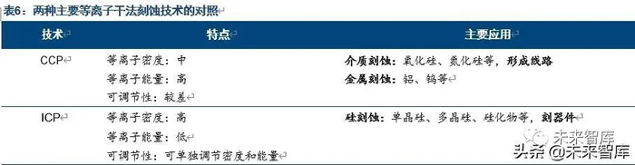 刻蚀机发展到干法刻蚀阶段以后,最重要的技术就是等离子体刻蚀。按照等离子体的生成方式,可以分为容性耦合等离子体(CCP/Capacitively Coupled Plasma )、感性耦合等离子体(ICP/Inductively Coupled Plasma)。由于等离子体产生的方式不同,刻蚀机的结构、性能和特点也存在较大的差异。其中 CCP 属于中密度等离子体,ICP 则属于高密度等离子体。CCP 技术的发明早于 ICP,但由于其特点的不同,两类技术并非相互取代,而是相互补充的关系。CCP 的等离子密度虽然较低,但能量较高,适合刻蚀氧化物、氮氧化物等较硬的介质材料;ICP 的等离子密度高,能量低,可以独立控制离子密度和能量,有更灵活的调控手段, 适合刻蚀单晶硅、多晶硅等硬度不高或较薄的材料。