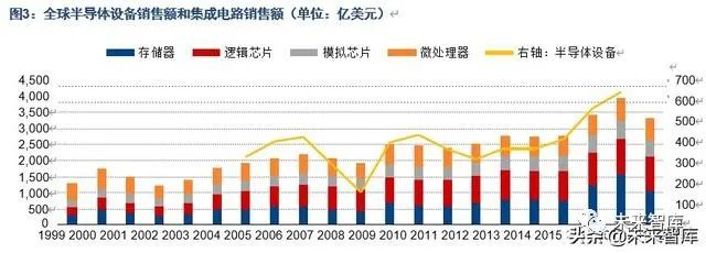世界半导体贸易统计协会(WSTS)的数据显示,2018 年全球半导体销售额为 4688 亿元,其中集成电路 3633亿元;2019 年由于存储器降价明显,全球半导体销售额下滑为 4090 亿美元,其中集成电路 3304 亿美元。近些年来半导体设备的销售额与集成电路销售额的波动大体同步,也体现了行业资本投资存在一定周期性。